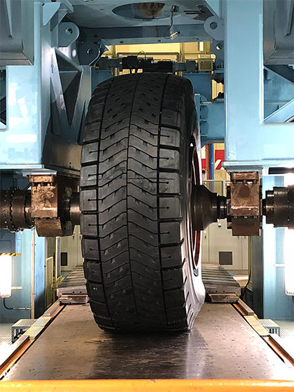 その後、同一のタイヤで、転がっている状態での試験を行います。ここでは、車両に装着したときの操縦性能や、最大200トンの負荷をかけてドラムに押し付けて回転させることで耐久性を評価します。尚、操縦性能や耐久性能は、お客様の現場で実際に車両に装着して最終評価を行います。