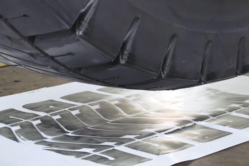 ここでは、接地している部分の形状や面積がどのようになっているか等を計測し、これまでに蓄積したデータと併せて、より均一に摩耗するタイヤになっているか等を確認します。