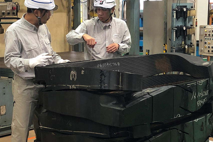 耐久性能を確認する上では、通常の使用状況よりも大きな負荷をかけて意図的にタイヤを故障させることもあります。故障させたタイヤは、内部の状態が見えるように切断して故障位置やメカニズムを調べ、より壊れにくいタイヤの開発に役立てます。ここでは、現場を取り仕切る大木社員と下川社員のORタイヤ試験課首脳会談で故障の分析を行いました。