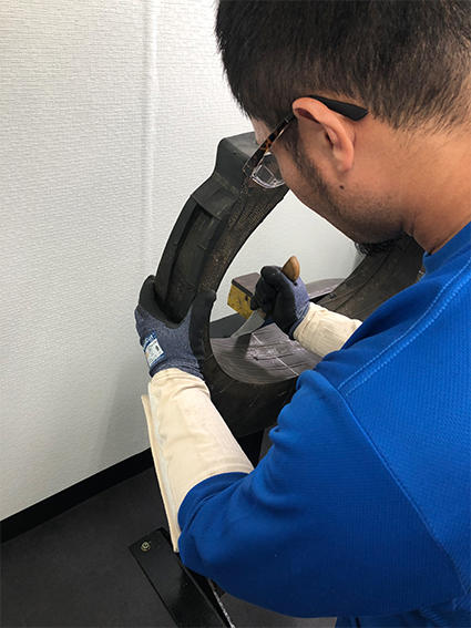 その後、ナイフでタイヤを細かく分解して、更に詳しく故障個所の分析を行います。このようにして「どの部分を強化すればタイヤの耐久性が向上するのか?」という情報を開発にフィードバックしますこの日に、マグロの解体ショーのようなナイフ捌きを見せてくれたのは、リム組みで匠の技を披露してくれた村田社員。作業着の下から筋肉が躍動していました。