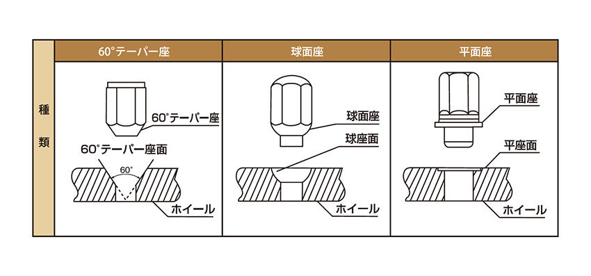 ナットにも、テーパー座、球面座、平面座の3種類あります。ホイールのナット当たり面によって、3種類のナットを使い分ける必要があります。