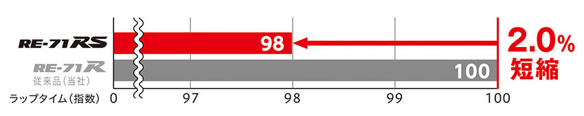 「POTENZA RE-71RS」は、従来品「POTENZA RE-71R」と比べ、ドライコースの最速ラップタイム比較で、2.0%の短縮できるタイヤに仕上がっています。