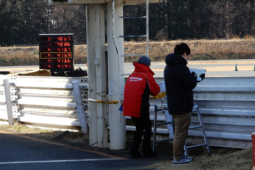 遠藤社員 サーキットでのタイヤテストはPOTENZAドライバーと一緒に行います。ドライバーにはグリップの高さやコントロール性、耐久性やタイヤの温まり具合など様々な項目について評価してもらい、それらについてコメントを貰います。ドライバーから得られたコメントやラップタイムなどから不足している性能を把握し、その後の開発に活かしています。