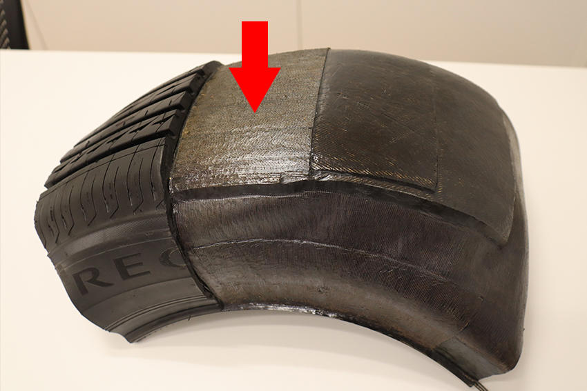 タイヤの中にはゴムだけでなく、有機繊維やスチールなどのさまざまコード(糸)が張り巡らされています。タイヤの種類によって異なりますが、このタイヤでは赤い矢印の部分がナイロンでできています。