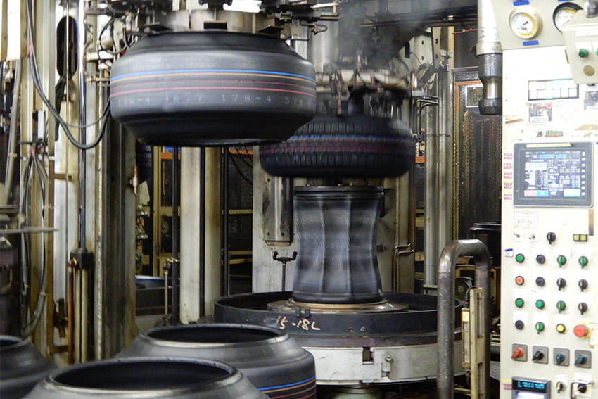 加硫工程は成型したタイヤを熱と圧力をかけて化学反応させる工程です。モールドと呼ばれる窯のようなものにタイヤの原型を入れ、“たい焼き”のようにモールドに押し当てることで溝や模様、文字が刻まれたタイヤになります。