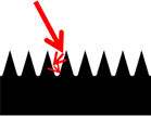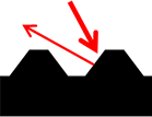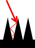 「微細加工による光吸収」とは、微細加工した凹凸側面に反射した光をさらに奥へと反射を繰り返すことでエネルギーを減少させる方法です。光を反射させる回数を増やすことで光そのものを吸収し、黒く見えるものです。