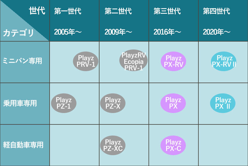 「Playz PX」シリーズは、従来の車種別専用設計を踏襲し、セダン・クーペ専用として「Playz PX」、ミニバン専用として「Playz PX-RV」、軽自動車・コンパクト専用として「Playz PX-C」をラインアップしていました。