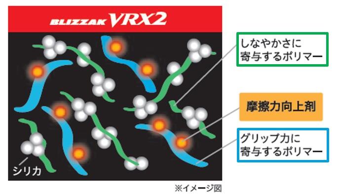 「さらに、VRX2に搭載されているアクティブ発泡ゴム2は、低温でもしなやかさを保つためのポリマーや、摩擦力向上剤と共にグリップ力向上に貢献するポリマーも当社独自のタイヤ・ゴムの知見とデジタルシミュレーションを駆使して配合されています。もちろんスタッドレスタイヤは発泡ゴムの進化だけではなく、タイヤの構造面の進化もあって性能を向上させてきていますが、その話も長くなるのでまたの機会にしましょう。」