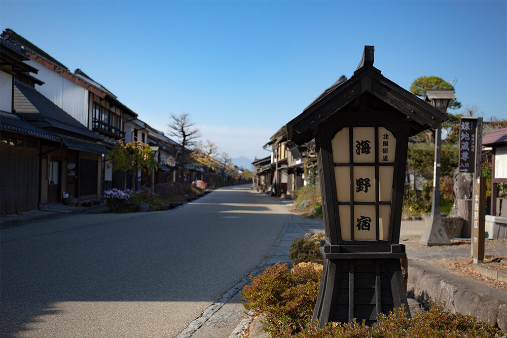 中山道と北陸道を結ぶ街道として多くの旅人が利用した北国街道。寛永2年(1625)に開設された長野県東御市本海野にある「海野宿」はこの街道を代表する宿場町のひとつです。およそ650m続く宿場町のなかには、防火壁の卯建(うだつ)が美しい建物など、江戸時代の旅籠屋造りや茅葺き屋根の建物、明治以降の蚕室造りの建物など約100棟の歴史的な建物が並んでいます。その道の中央には江戸時代から変わらず「表の川」とよばれる用水堰が流れています。歴史かおる街・海野宿として「日本の道100選」にも選ばれている場所です。