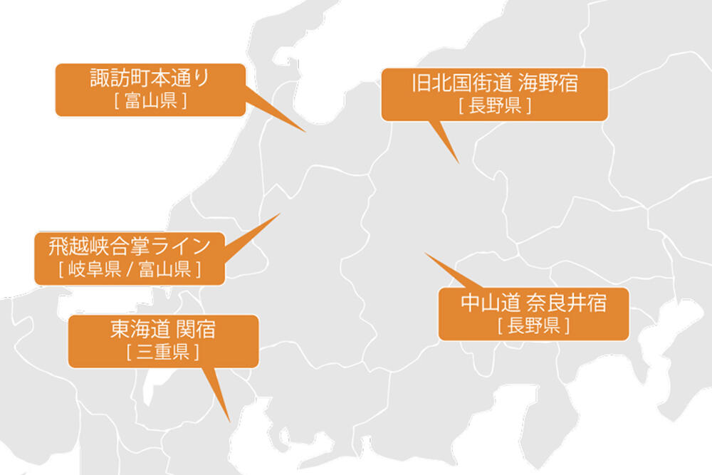 ブリヂストン創立90周年にちなんで独自に選出した「ブリヂストン日本の道90選」。中部編 パート1となる今回は、このエリアの歴史を語り継ぐ美しい街と道をセレクト。世界遺産となった合掌づくり集落をつなぐ「飛越峡合掌ライン」、江戸時代の雰囲気を残す石畳の美しい道である「諏訪町本通り」、そして200年以上もの年月を経ても当時の雰囲気をそのまま残す街道沿いの宿場町、「奈良井宿」「海野宿」をご紹介していきましょう。