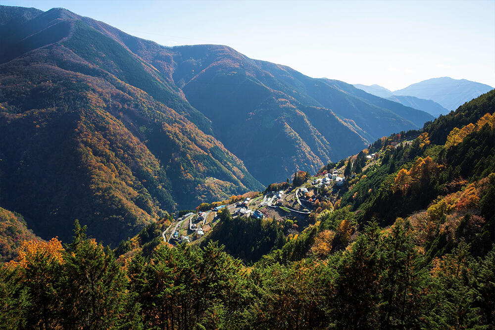 南アルプスに囲まれた山間の奥地にひっとりとたたずむ「下栗の里」。標高800m~1100m、最大傾斜38度の傾斜面に点在する畑や家屋は飯田市上村遠山郷を代表する景観で、「日本のチロル」「天空の里」と表現されるほどの絶景地です。スタジオジブリの短編映画「ちゅうずもう」の着想を得た場所としても知られています。狭く険しい山道を登って行くと下栗の里駐車場へ。ここから徒歩20分ほどの場所にある展望台「天空の里ビューポイント」からは下栗の里とその周辺の素晴らしい風景を堪能することができます。