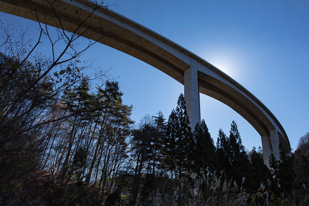 「鷲見橋」は岐阜県郡上市にある東海北陸自動車道の道路橋です。先進技術を惜しみなく投入した橋長436mの曲線橋で、開通当初は中央の橋脚高さが118メートルもあることで話題となりました。その後高鷲IC〜ひるがの高原SA間の4車線化に合わせて下り専用として2本目の橋が建設され、橋梁高125mを誇る橋脚高日本一の道路橋が誕生しました。高速道路を走行している時はその高さをほとんど感じられませんが、高鷲ICで高速道路を降り、鷲見川にそって走る県道452号線から眺めるとその高さに圧倒させられます。
