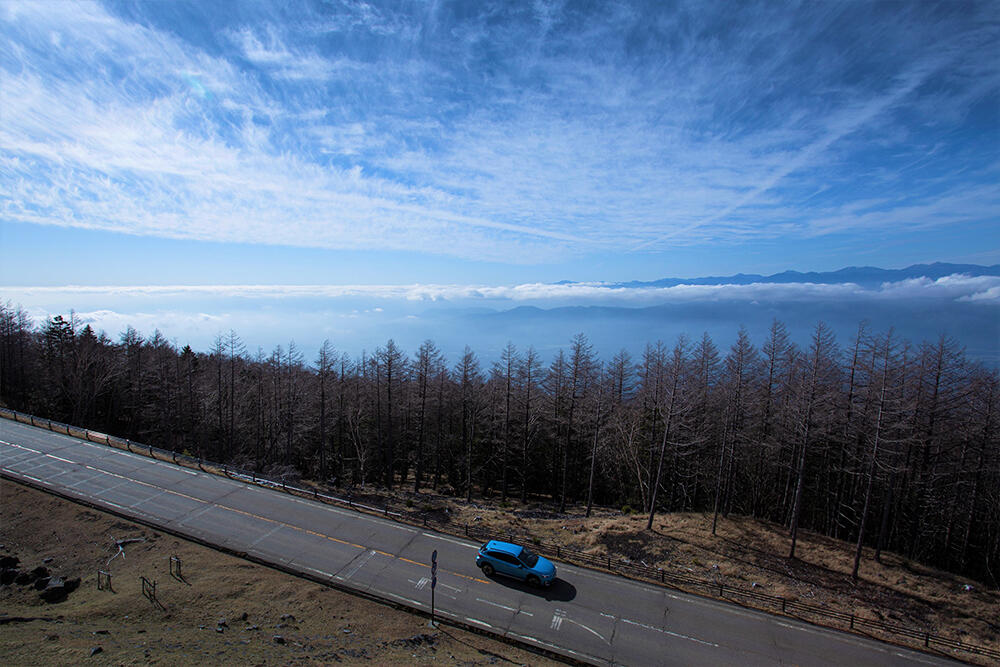 「ビーナスライン」は長野県茅野市から上田市の美ヶ原高原に至る全長76kmの観光道路です。平均標高は1400mで、八ヶ岳中信高原国定公園を縫うように標高1920mの美ヶ原高原まで駆け上がる国内有数のドライブルートとして人気を集めています。車山高原〜霧ヶ峰間は緩やかなコーナーが続き、落合から美ヶ原公園間は急勾配とつづら折れが続く本格的な峠道へ。この変化に富んだワインディングが、走りを楽しみたい人々を惹きつけています。美ヶ原高原では八ヶ岳や富士山、南・中央・北アルプスなどが一望でき、最高の眺望を堪能できます。