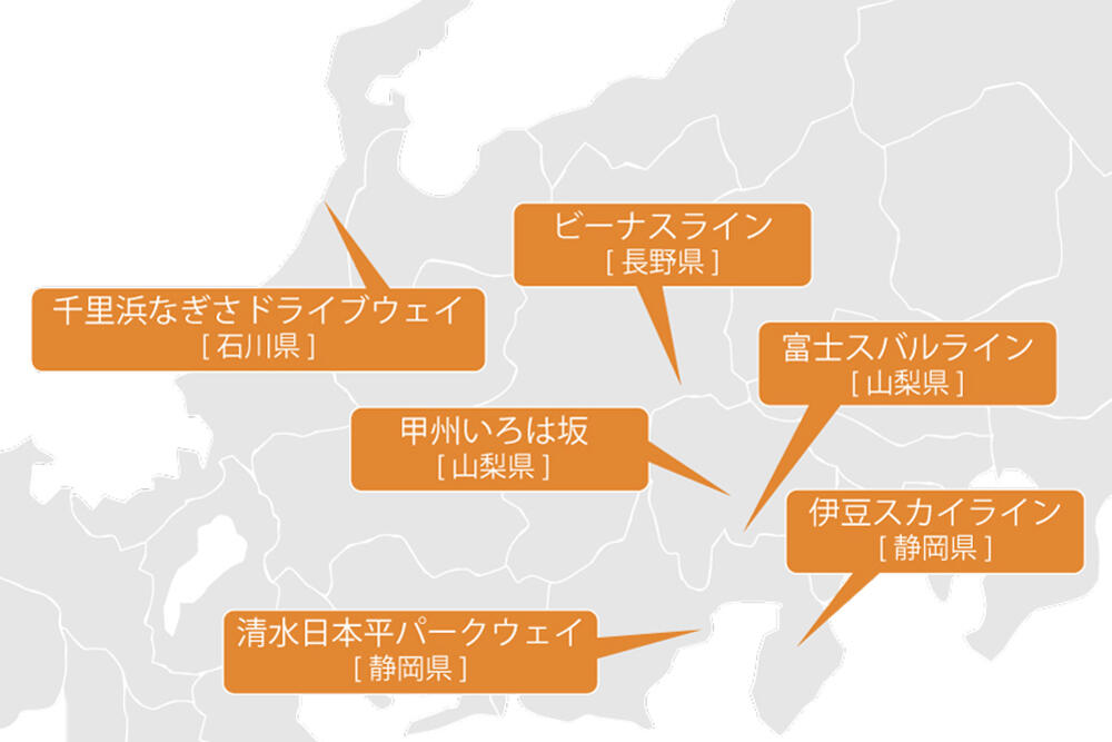 ブリヂストン創立90周年にちなんで独自に選出した「ブリヂストン日本の道90選」。中部編 パート3は絶景ドライブルートをテーマに、美しい風景を堪能させてくれる道をセレクトしました。日本で唯一砂浜でのドライブを楽しめる「千里浜なぎさドライブウェイ」、富士山の五号目まで一気に駆け上げる「富士スバルライン」、伊豆半島を縦断する絶景ワインディングである「伊豆スカイライン」、素晴らしい夜景を楽しませてくれる「清水日本平パークウェイ」、美しい紅葉が人気の「甲州いろは坂」、八ヶ岳中信高原国定公園を駆け抜ける「ビーナスライン」の6つの道をご紹介していきましょう。
