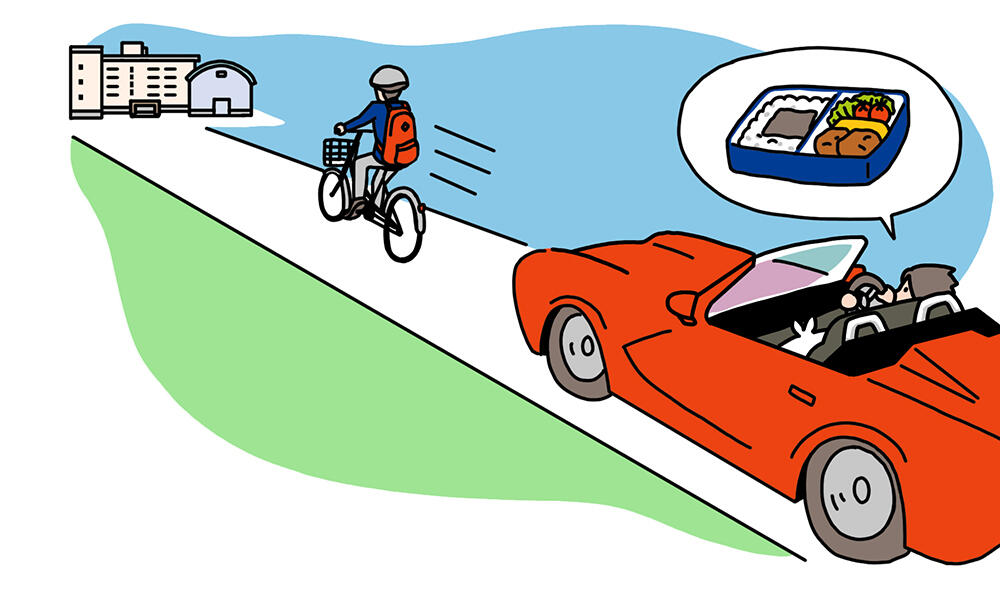 シンジ君が通学用自転車の「アルベルト」に乗って、6時30分に家を出て高校に向かいましたが、お弁当を家に忘れてしまいました。それに気付いたお父さんのカズオさんが、シンジ君にお弁当を届けるために、ブリヂストンのスポーツタイヤ「POTENZA」を装着したクルマを運転し、7時ちょうどに家を出発しました。シンジ君が自転車で走る速度は15km/hです。また、家から高校までの道はすべてシンジ君の家の私道で、15kmにわたって真っすぐ伸びており、信号も無く、他の車も走っていません。