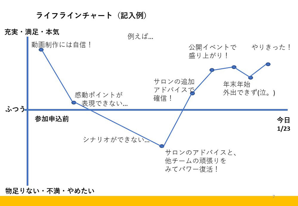 増井 中高生たちにこのプロジェクトを通じての成長を振り返ってもらいたいと考え、「ライフラインチャート※」の活用を提案し、記入してもらいました。記入してくれたチャートを見ると、「学校活動との両立が大変だったが、ボランティアの方が都度相談にのってくれたことで、最後まで頑張れた」とモチベーションを取り戻す中高生が多く、やりがいを感じました。