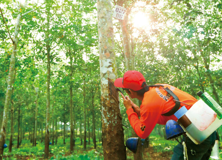 タイヤの主な原材料の一つに、ゴムの木から採取される天然ゴムがあります。