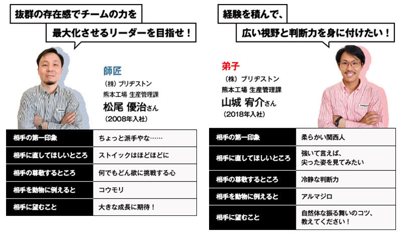 ブリヂストンで、先輩社員から後輩社員に伝わる一子相伝(?)の技術や考え方、お客様や仕事への思い。そこには、「師匠と弟子」の関係に似た、熱くドラマチック、でもなんだか身近な物語があります。ブリヂストンの意外な姿が垣間見えるかも!?