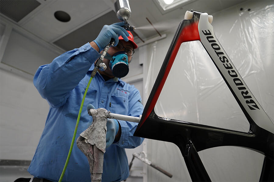 このブリヂストンの自転車は、緻密に計算・設計された車体に、熟練の技術を持つ職人が1台ずつ丁寧に手作業で塗装を施しています。何度も何度も塗りや研ぎ、焼きを重ねることで、繊細なデザインを実現しているのです。塗料だけでなく、職人の思いも一緒に塗り重ねられた自転車の完成です。