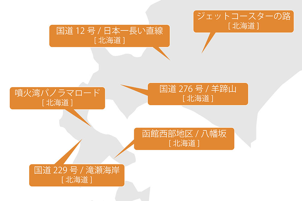 ブリヂストン創立90周年にちなんで独自に選出した「ブリヂストン日本の道90選」。北海道編 パート1となる今回は、北海道南部~中部の大自然を感じさせる道や美しい夜景と共存する道などをセレクト。白亜の断崖絶壁がみられる滝瀬海岸や日本一長い直線のある国道12号、約4.5kmの間アップダウンが続くジェットコースター路などをご紹介していきましょう。