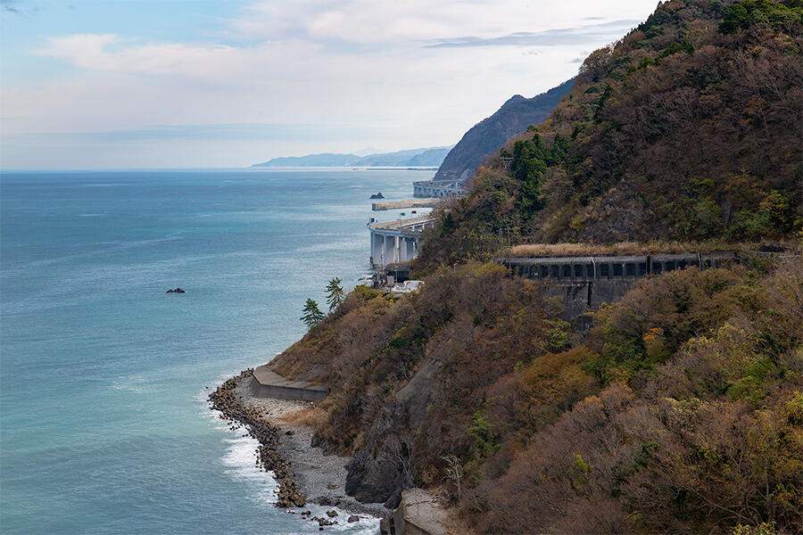 天険親不知線は、北陸道最大の難所として知られた天険親不知の断崖絶壁を貫通させ整備された随道です。古くから断崖絶壁と日本海の荒波が旅人の行く手を阻み、壮絶な逸話が数多く残されているこの地は親不知子不知(おやしらずこしらず)の語源となった場所としても知られています。明治時代から開削が始まり幾度もの改良と災害復旧を重ね、昭和63年(1988年)に当時の道路建設技術の粋を集め、日本初の海上高架橋、親不知海上インターチェンジを含む北陸自動車道が完成しました。天険親不知線は日本の道100選にも選出されているルートです。