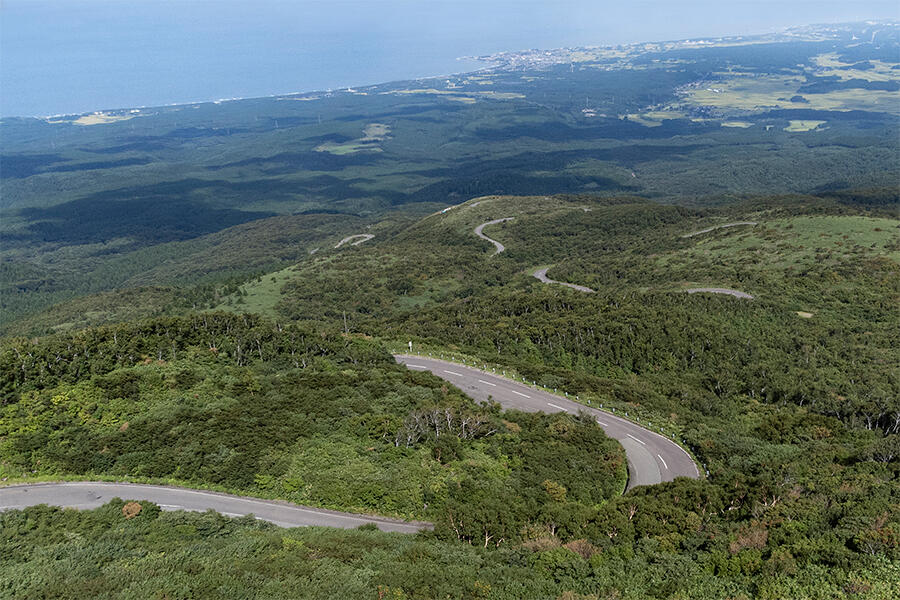 鳥海ブルーラインは山形県と秋田県にまたがる総延長は34.9kmの山岳道路。海抜0mから一気に1100mまで駆け上がり、標高2236mを誇る日本百名山のひとつ鳥海山(別名:秋田富士)の5号目へと向かいます。気持ちの良いコーナーを次々に抜け辿り着く大平山荘展望台からは日本海の美しい眺望を堪能でき、正面に飛島、北には男鹿半島、南には粟島や佐渡島なども遠望できます。また日本海に沈む夕日の景勝地でもあり、夜には空一面の星空を見ることができる場所としても知られています。なお11月初旬~4月下旬は閉鎖されます。