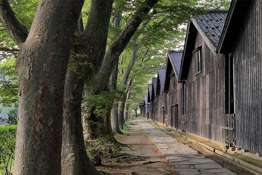 平安時代より出羽国府が置かれた場所として栄えてきた酒田市。この地において1893年(明治26年)に酒田米穀取引所の付属倉庫として最上川と新井田川に挟まれた通称「山居島」に建てられたのが山居倉庫です。建設された14棟のうち12棟が残っており、現在も一部は米穀倉庫として使用されています。建物の裏には夏の高温防止を目的に植樹された樹齢150年以上のケヤキ35本が連なるケヤキ並木があり、近年ではインスタ映えする道として人気を集めています。朝の連続テレビ小説「おしん」のロケーション舞台としても知られています。