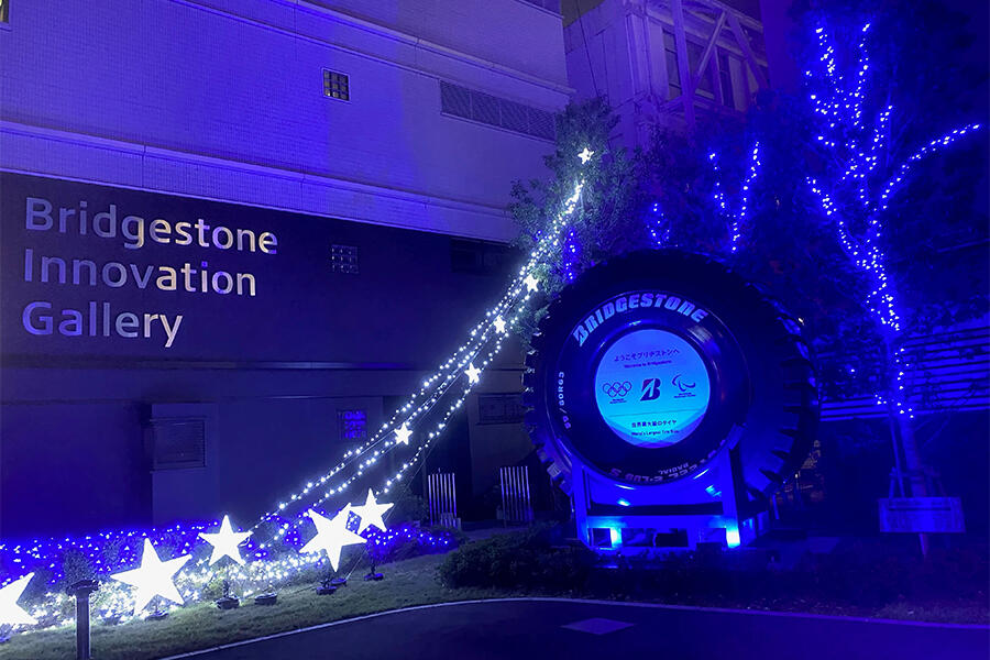 夜には、Bridgestone Innovation Park正門とBridgestone Innovation Gallery前で、医療従事者の皆さまへの感謝を込め、青色のイルミネーションを点灯しています。