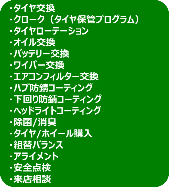 どのサービスもお勧めですが、特にこの時期、「履き替えた後のタイヤの保管はどうしよう」とお悩みの方も多いのではないでしょうか。そんな方には、クローク(タイヤ保管プログラム)がお勧めです。タイヤのプロであるタイヤ館がお客様の大切なタイヤを次の履き替え時期まで責任をもってお預かりします。