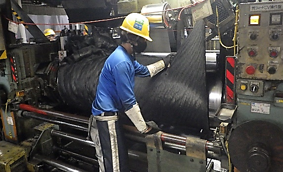 ※1 タイヤの原材料となる天然ゴムや合成ゴム、カーボンブラックなどを大型のミキサーで均一に練り合わせ、ロールに通してシート状の配合ゴムをつくる工程