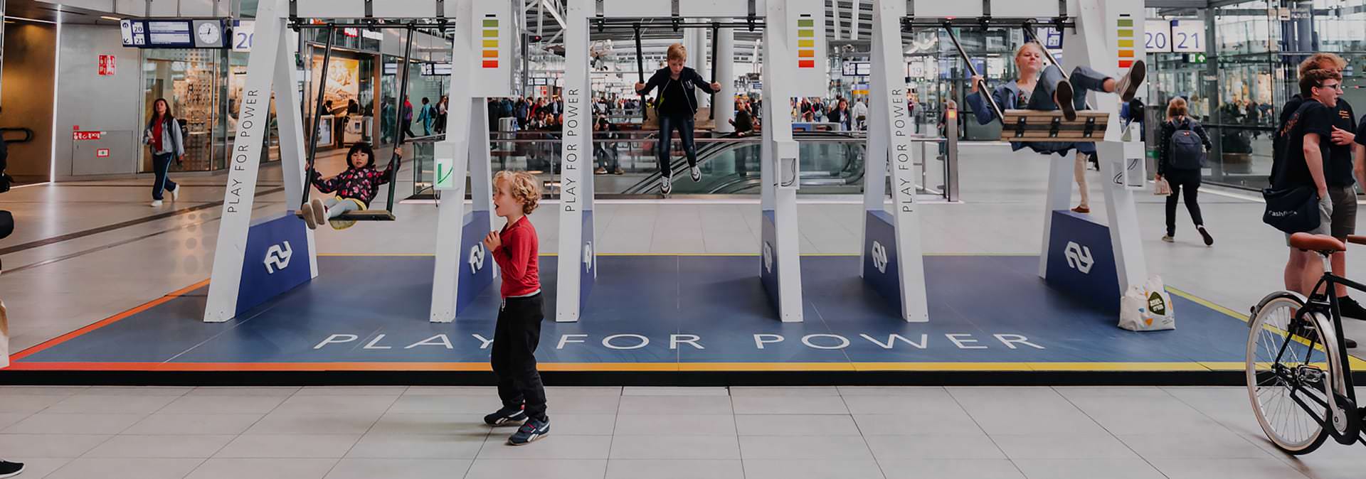 オランダ最大の駅、ユトレヒト中央駅。16のプラットホームを持ち、1日17万人以上の人が利用し、900本以上の電車が出発します。そんなハブ駅に、楽しく、かつ無料で携帯電話を充電できる、巨大ブランコが設置されました。3台あるブランコには列ができ、このブランコに乗るために電車を見送る人も現れたといいます。