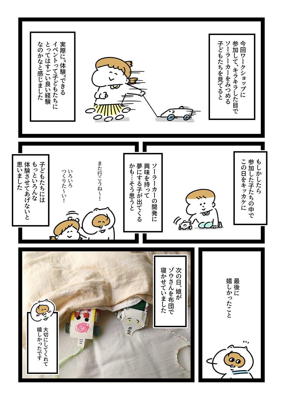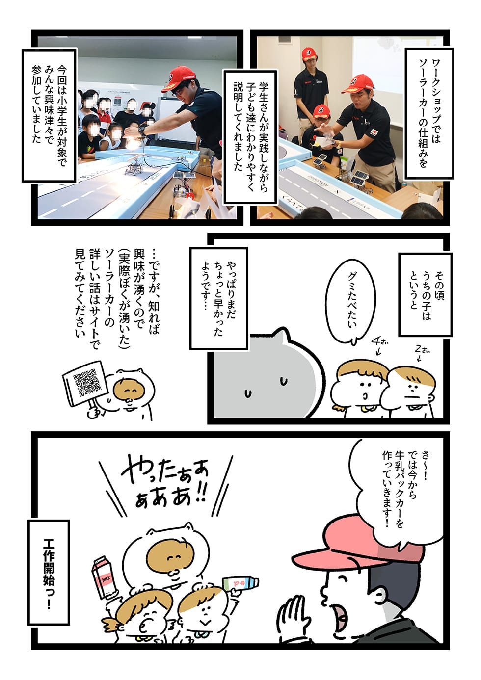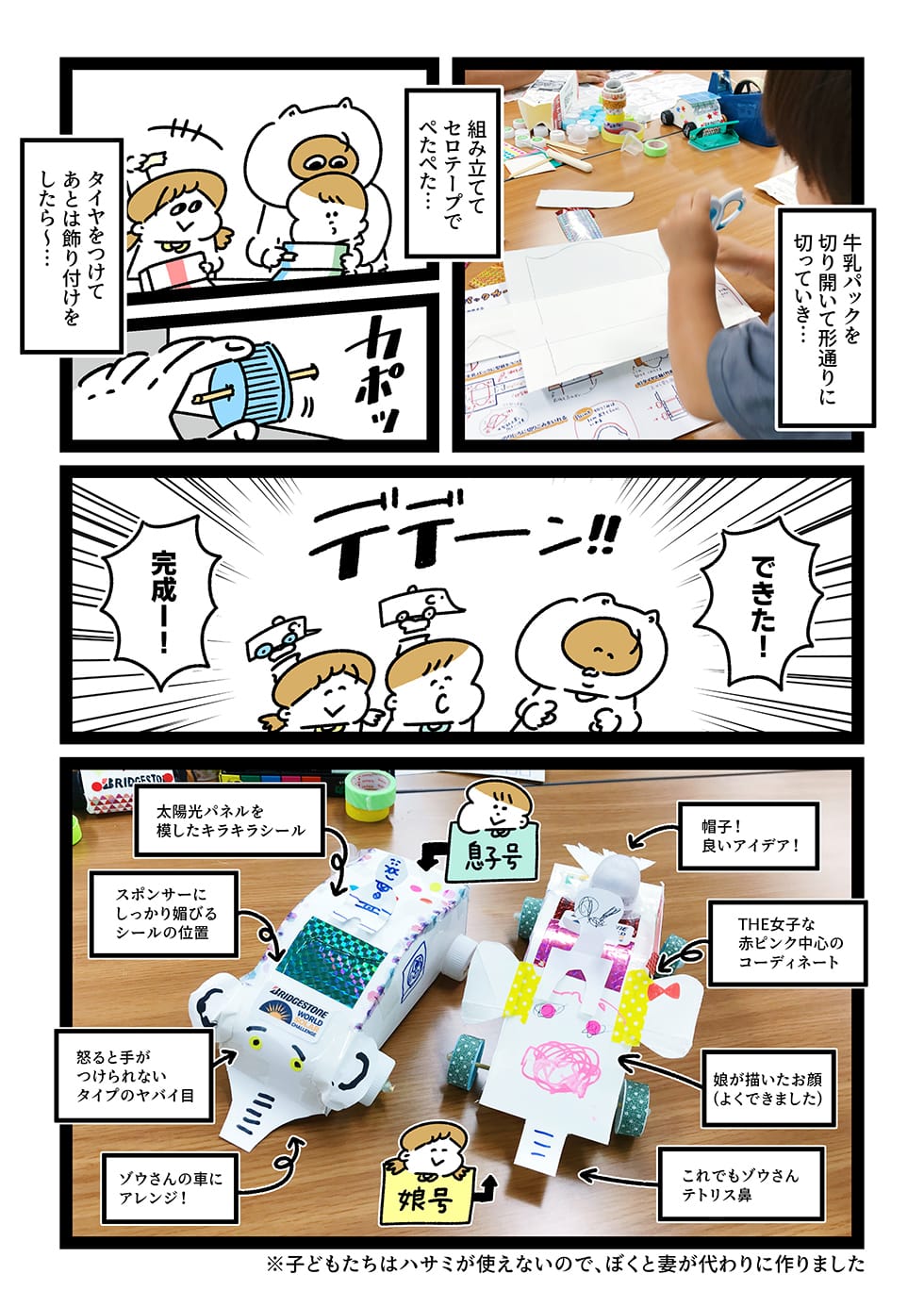 今回、このワークショップに参加させていただき、漫画に描いたように子どもたちにはまだ早かったんですが、ぼく個人的には参加していた他の子どもたちが、目をキラキラさせて説明を聞いたり、牛乳パックカーを作っているのを観て、イベントに参加する意義や、親としてこういう体験をさせてあげるということの重要さを感じました。