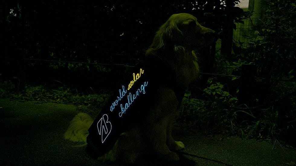 背中についたソーラーパネルで太陽光をエネルギーに変え、散歩バックの中に収納したバッテリーに蓄電。この電気を使って、ウェアに施されたワイヤーアートが光るというもの。今回はBWSC特別版として、ブリヂストンロゴとともにWorld Solar Challengeのタイトルを入れてみました。