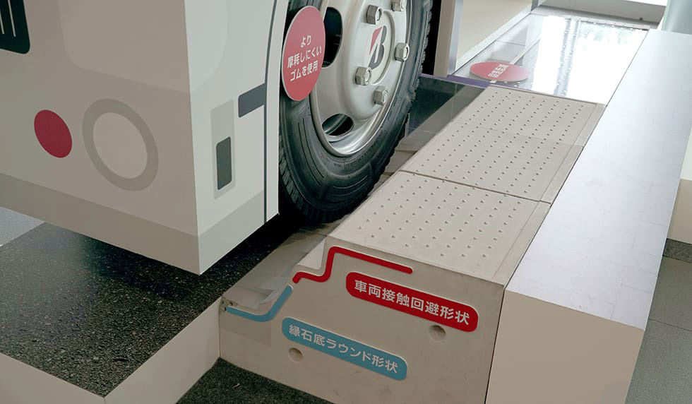一方で車椅子を使う人が、バスの乗り降りがしやすいようにバスとバス停がピッタリとくっついて停車できるようにする、バス停バリアレス縁石とバリアレスコンセプトタイヤを組み合わせた「バリアレス化システム」という仕組みも横浜国立大学、日本交通計画協会、アドヴァンス社と共に研究開発している。