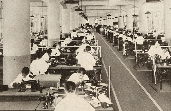日本足袋社におけるゴム靴の製造は、地下足袋にやや遅れて1923年10月に始まっています。当時、洋服の普及にともない履物も下駄や草履から靴へと移りつつありました。しかし革靴は高価であったため、日本足袋は安価な布製ゴム底靴が日用品として使用され、その需要が大きいのではないかという点に着目し、地下足袋製造のかたわらゴム靴(ズック靴)の製造にも乗り出していきました。