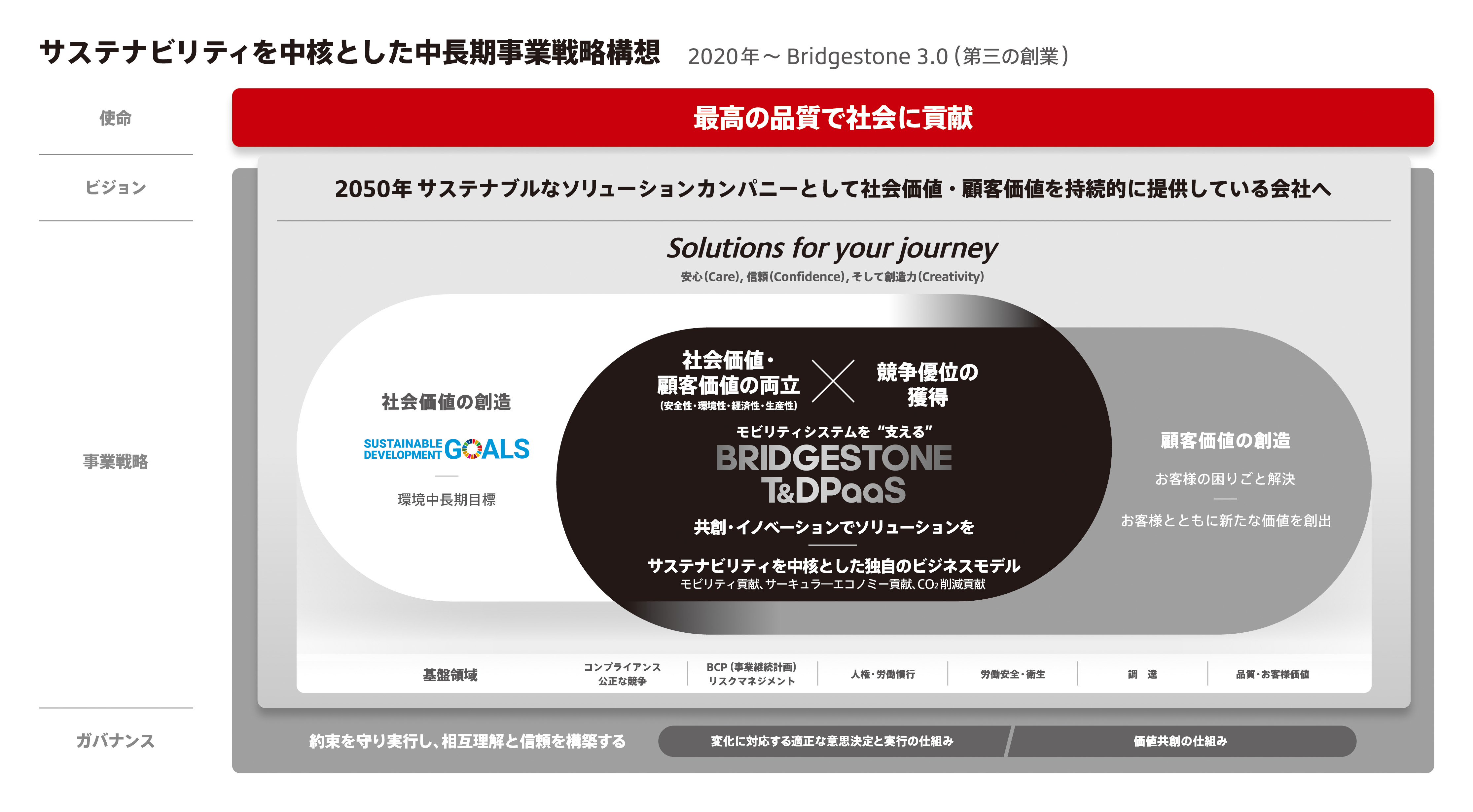 ブリヂストンはビジョンとして掲げた「2050年 サステナブルなソリューションカンパニーとして社会価値・顧客価値を持続的に提供している会社へ」の実現に向けて、サステナビリティを中核に据えた「中長期事業戦略構想」を策定しました。