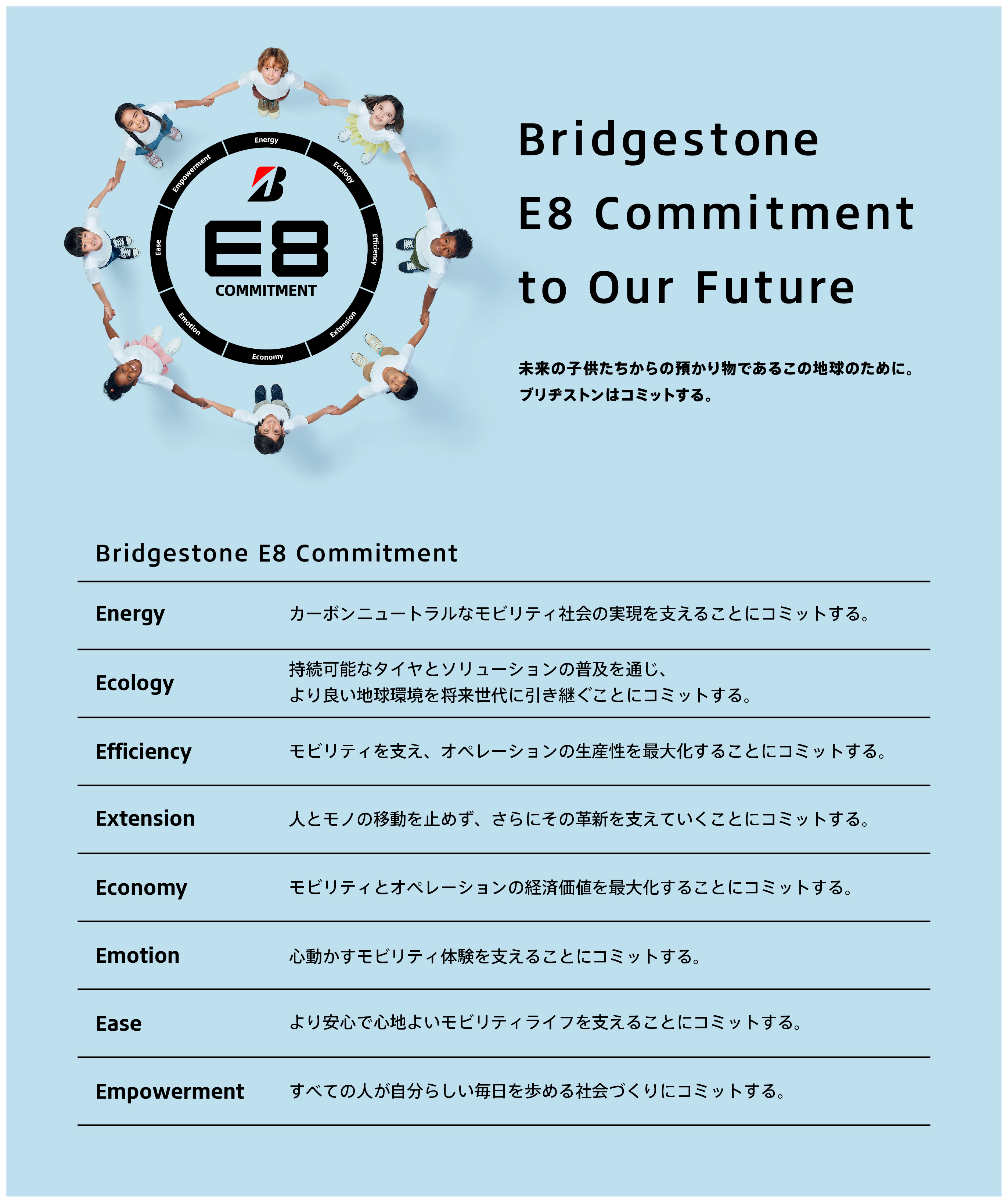 2022年3月に、ビジョンを具体化し、サステナブルなソリューションカンパニーへの変革を加速させるため、企業コミットメント「Bridgestone E8 Commitment ( ブリヂストン イーエイト コミットメント)」を制定しました。