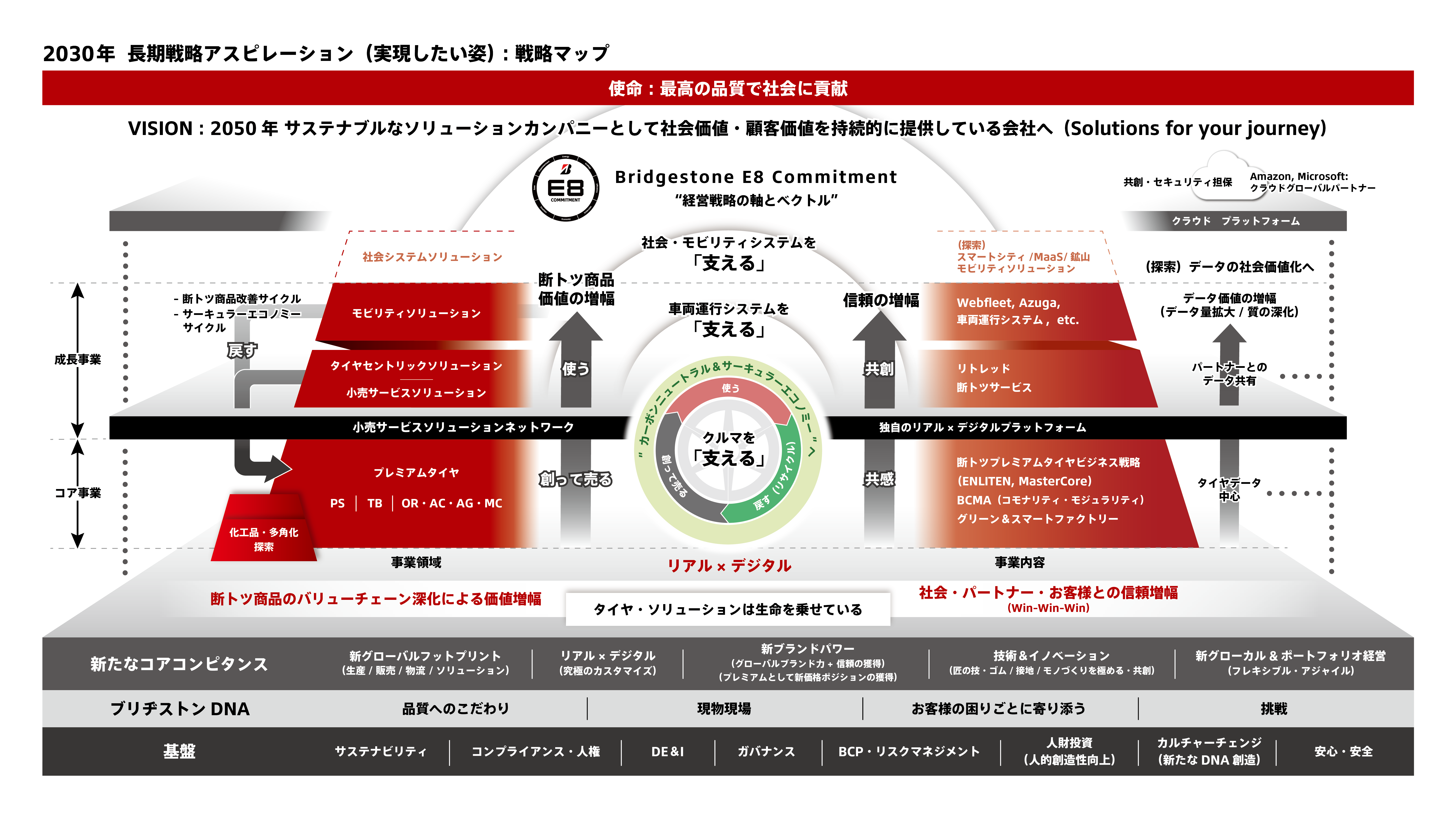2022年8月には、使命「最高の品質で社会に貢献」、ビジョン「2050年 サステナブルなソリューションカンパニーとして社会価値・顧客価値を持続的に提供している会社へ」の下、「Bridgestone E8 Commitment」を経営の軸とベクトルとし、2031年の当社の創立100周年へ向けた道筋として「2030年 長期戦略アスピレーション(実現したい姿) 」を明示しました。第三の創業以降、激動の事業環境の中、常態化する変化に動ぜず、ゴムのように強靭でしなやかに変化をチャンスに変えるレジリアントな”エクセレント“ブリヂストンへの変革を目指しています。