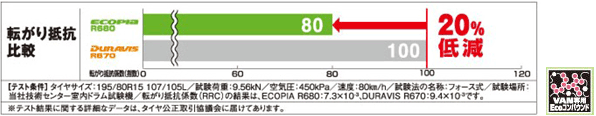 今回発売する「ECOPIA R680」は、当社の材料技術「NanoPro-Tech(ナノプロ・テック)」※1 を採用しています。さらに、シリカ配合の低燃費トレッドゴム「VAN専用ECOコンパウンド」を新たに採用することで、高い低燃費性能を達成。当社バン・小型トラック用タイヤ「DURAVIS R670(デュラビス アールロクナナマル)」との性能比較では、転がり抵抗で20%の低減を実現しています。