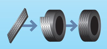 | ※2 | バンダグ方式とは、あらかじめ加硫してあるトレッドゴム(プレキュアトレッド)を貼り付け、再度加硫して圧着するリトレッドタイヤ製造方法のこと。「プレキュア方式」とも呼ぶ。![]() <参考>バンダグ方式でのリトレッドタイヤ製造方法イメージ図 |
