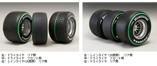 | 各グランプリにコンパウンド(ゴムの硬さ)が異なる2種類のドライタイヤと、タイヤの溝深さが異なる2種類のレインタイヤを供給。各々2種類のタイヤを識別するために、ドライタイヤの柔らかい方とレインタイヤの溝の深い方(大雨用)にグリーンラインを引きます。ドライタイヤはサイド部に、レインタイヤはセンター溝にグリーンラインを引きます。 |