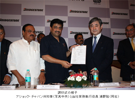 本日、ムンバイ市内の式典会場において、マハラシュトラ州知事のアショック・チャバン氏および、ブリヂストン株式会社 常務執行役員 海外タイヤ事業管掌 浦野隆の出席のもと、調印式が盛大に執り行われました。