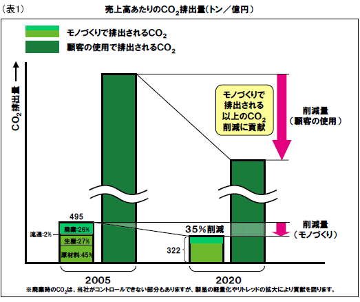 全製品を対象としてその原材料調達から生産、流通、製品廃棄にいたるモノづくりの過程で排出されるCO2を売上高当たり35%低減。 |