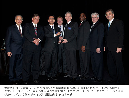 授賞式は4月13日に米国ワシントン州シアトル市にて行われ、当社グループからは特殊タイヤ事業本部長の仁保 滋およびブリヂストン エアクラフト タイヤ(ユーエスエー)・インク社長のジョー・レイナが出席し、ボーイング社副社長のレイ・コナー氏、スタンリー・ディール氏よりトロフィーを授与されました。