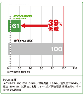 | 1.「よく転がる」: | 従来品「B’STYLE EX(ビースタイル イーエックス)」対比 転がり抵抗を39%低減(転がり抵抗性能グレード「AAA」) |