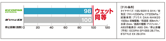 | 2.「よく止まる」: | 従来品「B’STYLE EX(ビースタイル イーエックス)」同等のウェットブレーキ性能を確保(ウェットグリップ性能グレード「c」) |