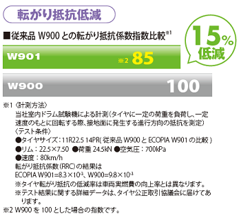 | 1. | 新開発の「氷雪系低燃費発泡ゴム」を採用することで、高い低燃費性能を実現。従来品「W900」 対比転がり抵抗を15%低減 |