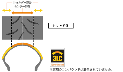 1. トレッド技術 「3LC(スリーエルシー)(3Layer(スリーレイヤー) Compound(コンパウンド)=3分割トレッド)」を採用し、コーナリング時のグリップ力とリニアなハンドリング特性を高次元で両立。