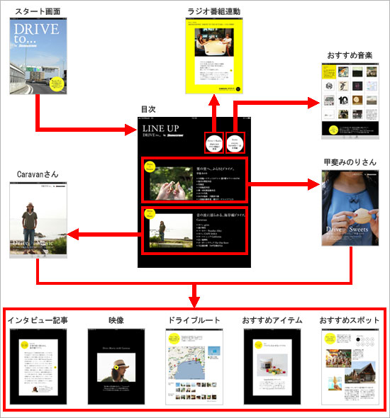 「DRIVE to...by BRIDGESTONE」は、著名人が東京から日帰り・1泊で気軽に行けるとっておきのドライブルート・スポットを紹介するドライブガイドアプリです。iPadの特徴である高解像度スクリーンを活かした鮮やかな画像・動画に加えて、ネットワーク接続機能を活用したリアルタイムでの情報提供を実現し、これからの行楽シーズンに向けて、充実したドライブシーンをサポートするガイドとしてご活用いただけます。| 内容 | ナビゲーター | |