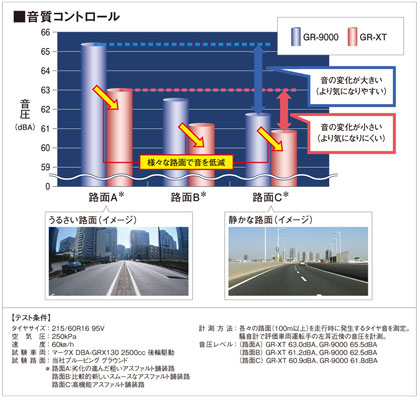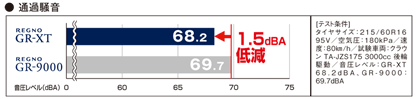 通過騒音とは車が走行する際に、車外に向けて発生する音です。タイヤから発生する音も通過騒音の要因の一つとなります。通過騒音は環境性能のひとつとして重視されており、GR-XTは、この通過騒音にも配慮したタイヤです。